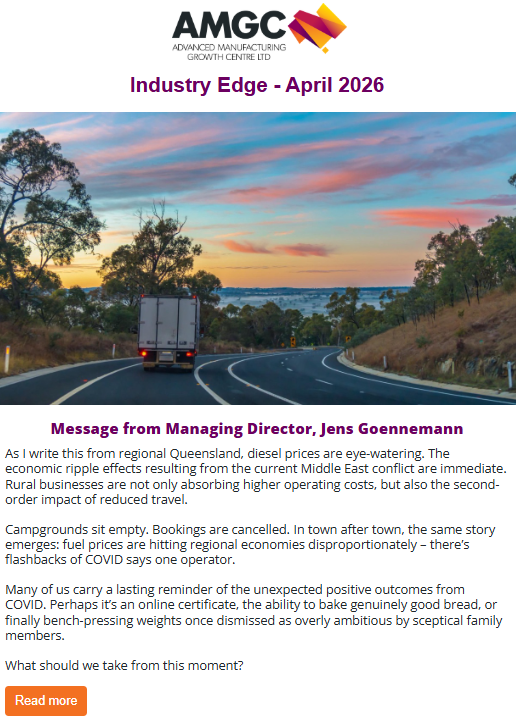 This month’s Industry Edge features a message from Jens Goennemann, discussing the economic ripple effects from the current Middle East conflict and what should we take from this moment. Read about the latest investment in the Wind Energy Manufacturing Co-Investment Program, supporting Camco Engineering’s transition into the rapidly growing wind energy sector. AMGC is pleased to be a supporting partner of Australia Wind Energy 2026 taking place on 8-9 July 2026 in Melbourne, register here. AMGC has recently updated its website with a refreshed design and improved usability, check it out here!